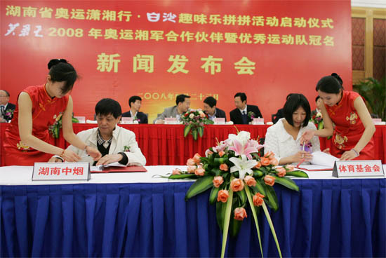 图为湖南省体育局副局长、湖南省体育发展基金会理事长唐九红(图右)与湖南中烟党组成员、副总经理蒋效拉(图左)现场签约。